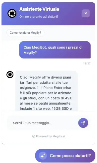 Dalla prima domanda sul prodotto al supporto dopo l’acquisto: Megibot è presente sul sito come assistente virtuale, aumentando la conversione e migliorando la soddisfazione cliente.
